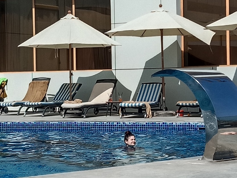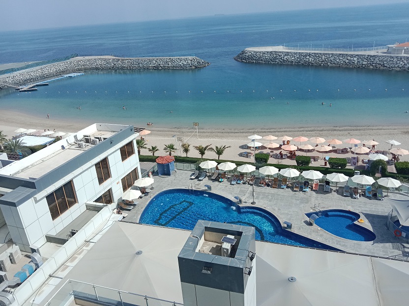 Отель, в котором мы жили, расположен на первой береговой линии, так что можно было просыпаться и засыпать под шум Оманского залива. Пляж чистят, там можно поиграть в волейбол, чем мы с дочкой не преминули воспользоваться. Для туристов отведено довольно много морского простора для купания, но лучше за буйки не заплывать, на мой взгляд. Хотя такие смельчаки нам встречались. Интересно, что бухта там сделана специальными насыпями из огромных камней с выходом в ширь океана, и на входе стоит сетка - видимо, от большой морской живности. Или чтобы какие-нибудь особо неугомонные туристы не оказались в открытом океане.