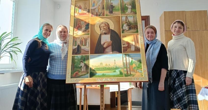 Руководитель иконописной мастерской «Лики» Надежда Королева рассказала, что эта икона прп. Серафима Саровского с житием, размером 140 на 110 см, была передана для храма вмч. Димитрия Солунского во Владивостоке. На иконе 11 житийных клейм.
