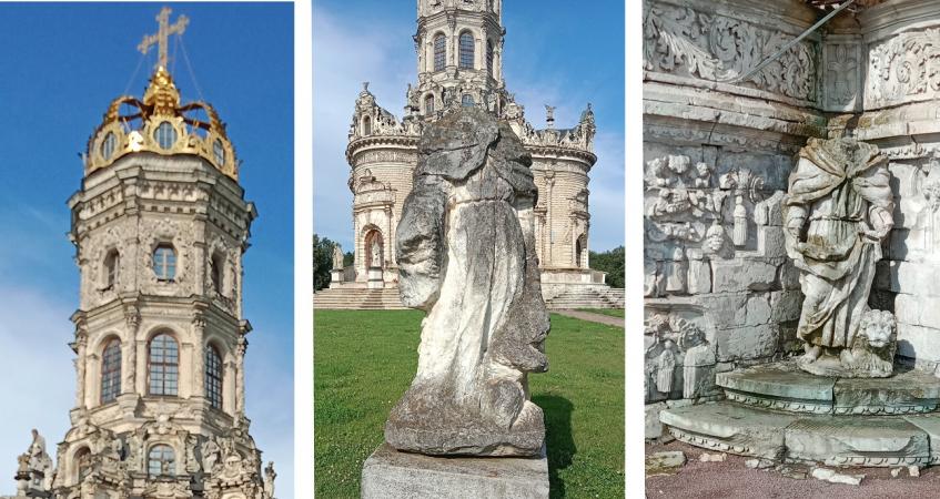 Привычного купола у храма нет - Знаменскую церковь венчает корона - подражание голландской архитектуре. Оформление цокольной части храма чем-то напоминает белокаменное владимиро-суздальское зодчество - в частности, знаменитый храм Покрова на Нерли за счет каменой резьбы: здесь множество цветов, веточек и плодов.