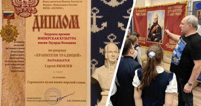19 января в Москве в конференц-зале Союза писателей России председателю общественной организации ветеранов ВМФ города Сарова Сергею Яковлеву вручили премию «Имперская культура» имени Эдуарда Володина в номинации «Хранители традиций». Премия была вручена за создание Саровского музея военно-морской славы имени адмирала Федора Ушакова.