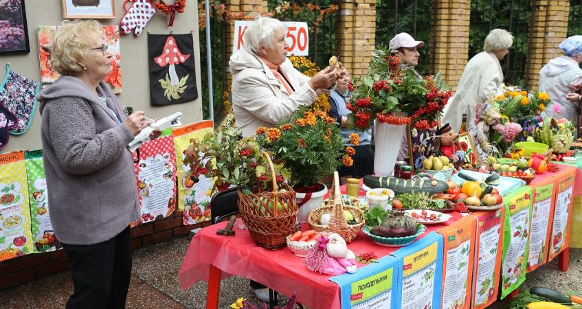 Посмотрите, как красиво оформлены столы каждого совета ветеранов! Здесь и букеты из цветов, и композиции из овощей и фруктов, и экспонаты, выполненные из природных материалов. Пенсионеры не только демонстрируют свой урожай, но и делятся рецептами засолки, семенами урожайных культур.