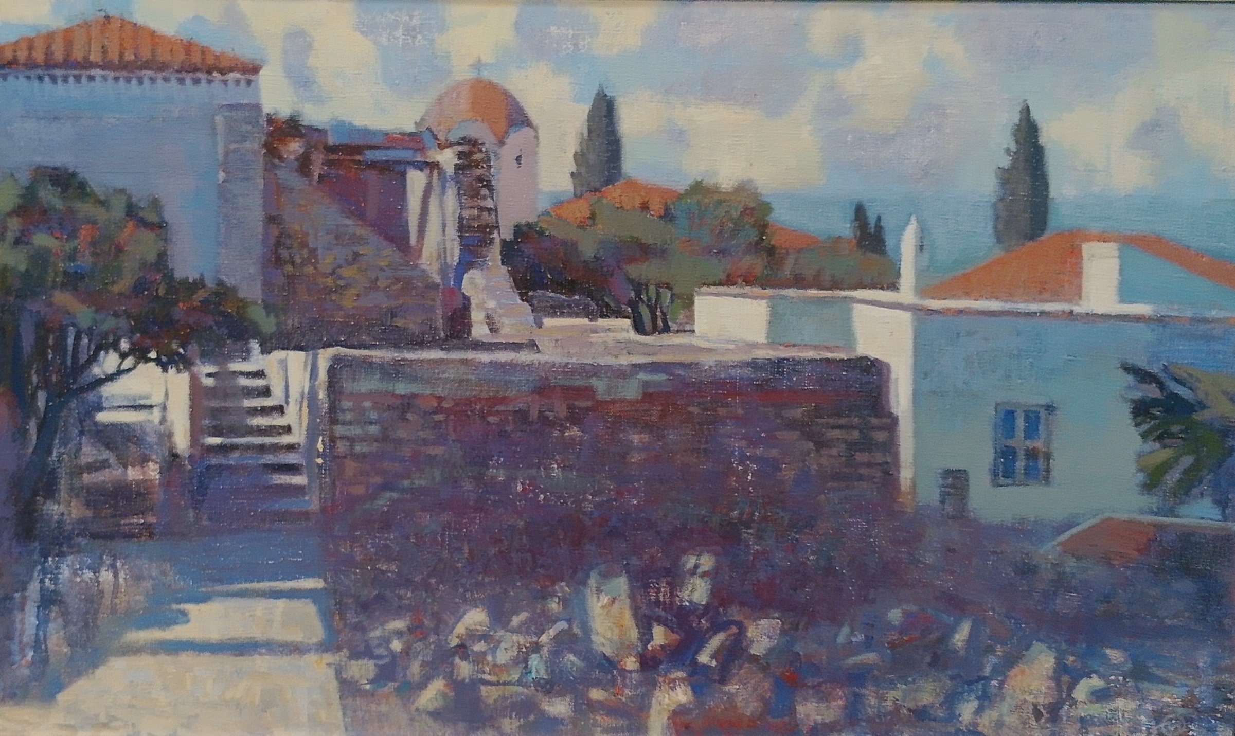 Экспозиция разделена на три темы. В серию «Море рядом» вошли работы о Крымском побережье и посвященные греческим мифам. «Под куполом небес» – серия пейзажей, где небу и облакам отведена не последняя роль. И серия, название которой дало имя всей выставке «Плывут, как мысли, облака», собрала сложные композиционно натюрморты.