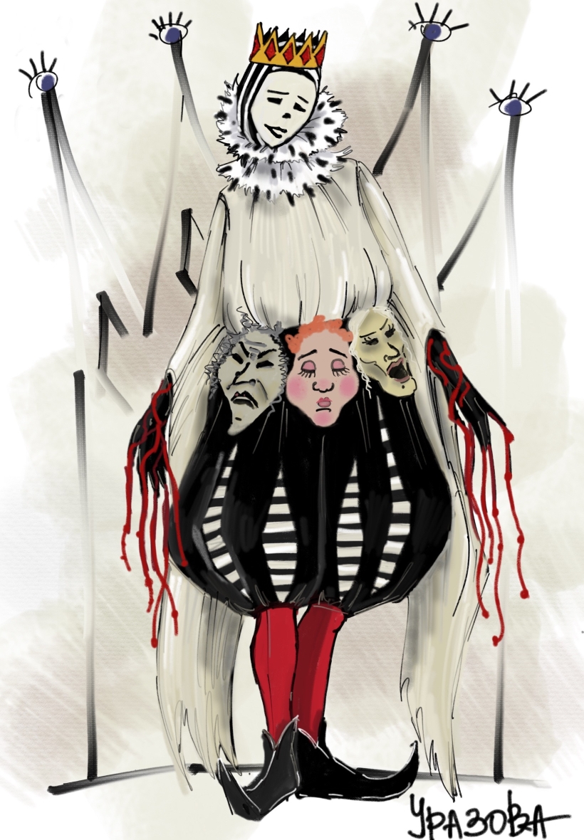Нужно было выбрать персонажа и нарисовать эскизы для него. Нам предложили на выбор три произведения. Я выбрала Короля из «Обыкновенного чуда», но не стала делать только эскиз, а решила сразу отшить костюм, чтобы показать, что эскиз рабочий и его реально воплотить. Мне очень помогла наш бутафор Дарья Бердова, она сделала маски из папье-маше: Король ведь постоянно «меняет лица», ссылаясь на то, что его недостатки от предков. Так что эти маски – его «предки».
